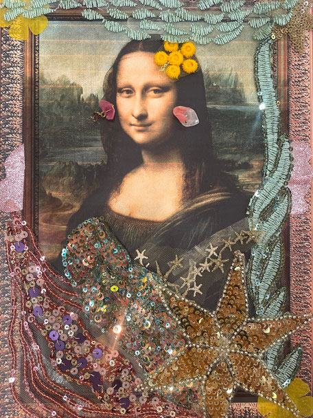 ■タイトル:ドレス生地の余り布でSDGs「モナリザ」コラージュと「プリマヴェーラ」のフラワーアレンジメント